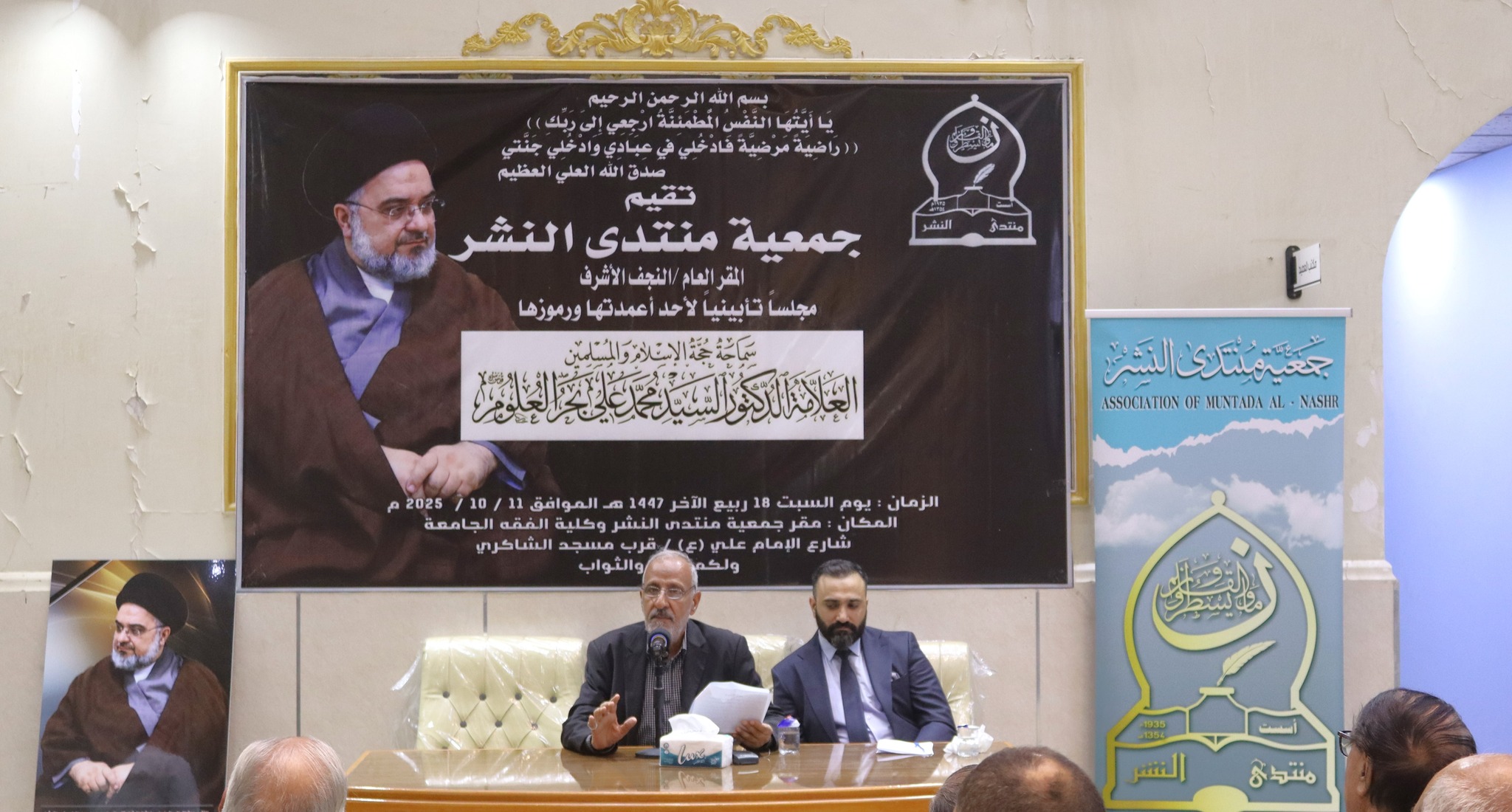 نظمت جمعية منتدى النشر المقر العام في النجف الاشرف مجلساً تأبينياً لمرور 40 يوماً على رحيل حجة الاسلام والمسلمين سماحة السيد الدكتور محمد علي بحر العلوم ( ر ه ) السبت 11 / 10 2025م في مقر الجمعية وباحة كلية الفقه الجامعة التابعة لها في النجف الأشرف. استهلت الامسية بآيات من الذكر الحكيم تلتها كلمة للدكتور كمال الفضلي رئيس الهيئة الادارية للجمعية الذي عزى الامة الاسلامية والاوساط العلمية والاكاديمية واسرة الفقيد بهذا المصاب الجلل .