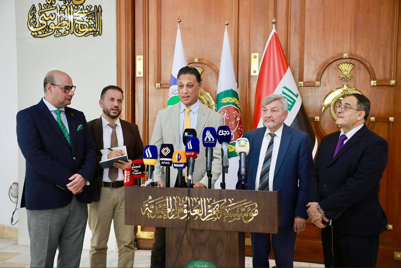 بعد ذلك عقد الجانبان مؤتمرا صحفيا مشتركا بحضور وسائل الاعلام، ابتدأه الدكتور بحر العلوم بالتأكيد على ان هذه المذكرة لها اهتمامات كثيرة تتعلق بأهداف المؤسسة، وان الهدف منها أن تتكون هناك شراكة بين هذه المنظمة الدولية العريقة العالمية في قضايا التنمية وبين مؤسستنا في تفاصيل كثيرة ومنها ما يتعلق بالإبتكار والقضايا المهمة التي تهم الشباب والشابات والباحثين في معهد العلمين للدراسات العليا، واصفا المذكرة بانها خطوة تمهيدية نحو شراكة مع UNDP والحكومة العراقية في سبيل مشروع تنمية الجنوب، حيث تحاول هذه المنظمة تقديم رؤية ممنهجة جديدة للتنمية في العراق تتبنى التنمية المكانية وليس التنمية القطاعية، وتحاول توظيف كافة الجهود الحكومية في المجالات المتعددة، وكذلك الخبرة الدولية، وستكون المؤسسة كجسر اجتماعي مؤثر في علاقاته مع المجتمع في محافظات الجنوب، معربا عن امله بان يكون الجنوب نموذجا لتنمية يمكن أن يصدر لباقي مناطق العراق.، متمنيا ان هذه التنمية ناجحة ومفيدة لمستقبل العراق ومستقبل التنمية، وخاصة التي تم تحديدها الآن في ضمن هذه الشراكة هي محافظة البصرة وميسان والناصرية والسماوة.